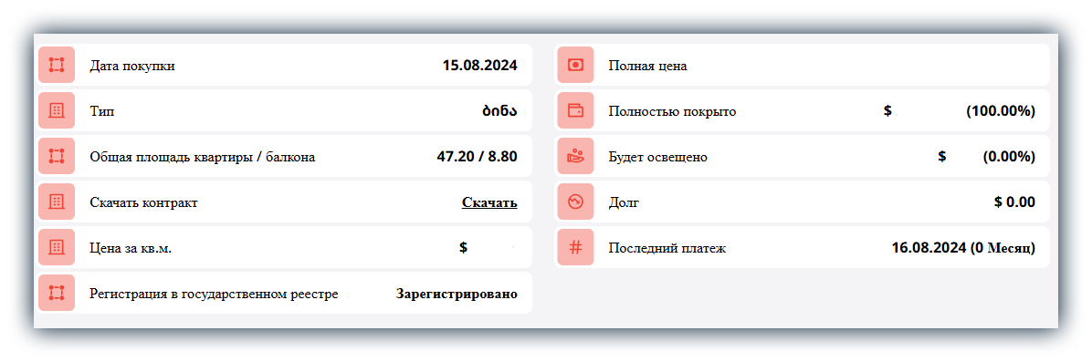 Баланс - После использования вашего реферального кода, когда новый покупатель вводит ваш индивидуальный код при покупке квартиры, на ваш баланс будет зачислено 300 GEL, которые вы можете использовать только путем перевода на баланс обслуживания здания;